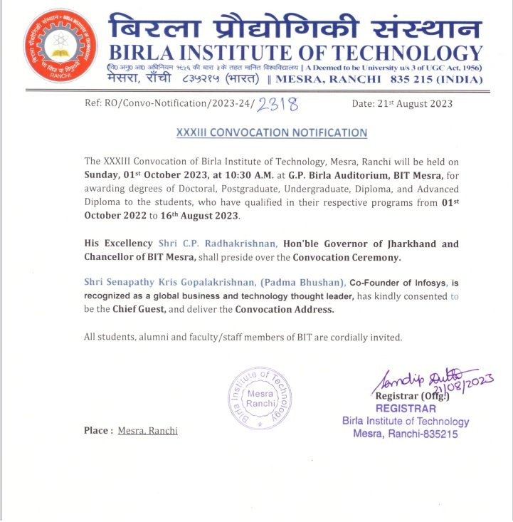 BIT मेसरा का 33वां दीक्षांत समारोह का आयोजन हो रहा है, जो एक अक्टूबर को जीपी बिरला ऑडिटोरियम में आयोजित होगा। सबसे खास बात यह है कि इस बार के दीक्षांत समारोह में ऐसा पहली बार होने वाला है जब सभी कैंपस के विद्यार्थियों को एक साथ डिग्री दी जाएगी।