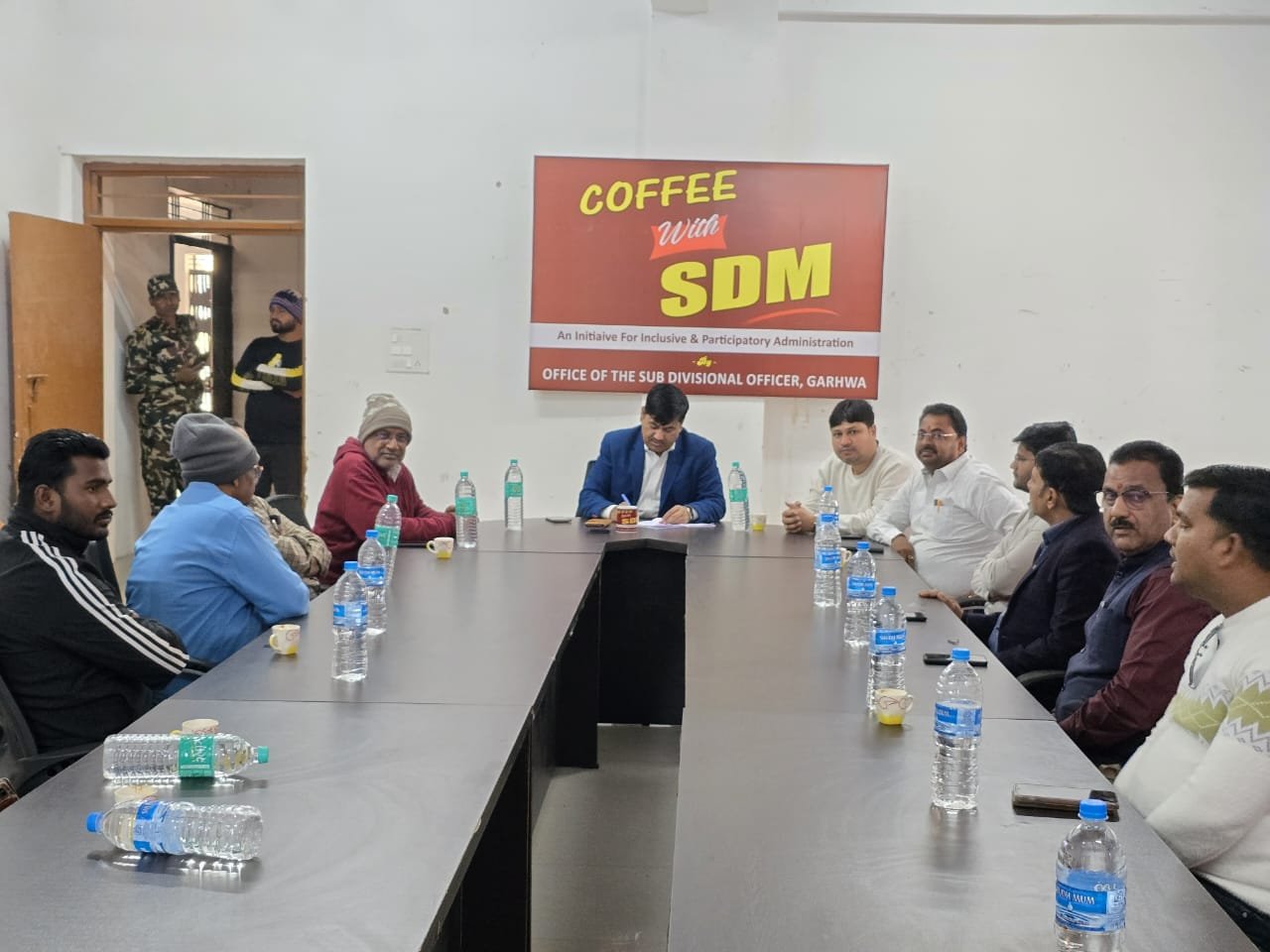 गढ़वा। बुधवार को पूर्व निर्धारित समयानुसार आयोजित “कॉफी विद एसडीएम” में गढ़वा के प्रमुख व्यवसायियों ने शिरकत की। एसडीओ संजय कुमार के आमंत्रण पर अनुमंडल कार्यालय स्थित सभागार में आयोजित इस विशेष कार्यक्रम में पहुंचे व्यवसायियों ने गढ़वा की बेहतरी के लिये कई अहम सुझाव दिए, साथ ही अपनी समस्याओं को भी एसडीओ के समक्ष रखा। कार्यक्रम की शुरुआत में संजय कुमार ने सभी का स्वागत करते हुये सभी से बिना संकोच अपनी बात रखने का अनुरोध किया। लगभग आधा घंटे के अनौपचारिक वार्तालाप के बाद सभी ने एक-एक कर अपनी बातों को रखा।
