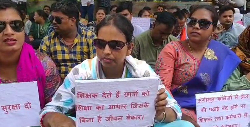 रांची : सरकार की नई शिक्षा नीति के खिलाफ झारखंड अंगीभूत महाविद्यालय इंटरमीडिएट अनुबंध शिक्षक एवं शिक्षकेतर कर्मचारी संघ के द्वारा समायोजन सहित अन्य मांगों को लेकर राजभवन के समक्ष एक दिवसीय धरना प्रदर्शन किया गया। शिक्षकों का कहना है कि सरकार की नई शिक्षा नीति के तहत 10$2 प्लस टू में पढ़ रहे बच्चों को समायोजन करने का निर्णय लिया गया है। जिसके कारण उन बच्चों के साथ-साथ हम शिक्षकों को भी काफी दिक्कतों का सामना करना पड़ रहा है क्योंकि अगर महाविद्यालयों में पढ़ाई बंद हो जाएगा, तो हम अनुबंधित शिक्षक लगभग 5000 शिक्षक बेरोजगार हो जाएंगे। वहीं दूसरी तरफ जो बच्चे इस महाविद्यालय में पढ़कर पार्ट टाइम जॉब करते हैं उनके लिए भी दिक्कतों का सामना करना पड़ेगा।