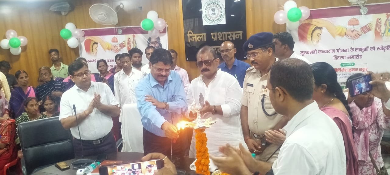 महिला, बाल विकास एवं सामाजिक सुरक्षा विभाग अंतर्गत मुख्यमंत्री कन्यादान योजना के तहत लाभुकों को स्वीकृति पत्र देने हेतु समाहरणालय के सभाकक्ष एवं समाहरणालय परिसर में कार्यक्रम आयोजित किया गया, जिसमें मुख्यमंत्री कन्यादान योजना के विभिन्न लाभुकों को स्वीकृति पत्र देने गोदभराई, अन्नप्राशन, हेल्थ बेबी शो, मेहंदी, रंगोली आदि समेत कई अन्य कार्यक्रमों का आयोजन कराया गया। मुख्यमंत्री कन्यादान योजना के लाभुकों को स्वीकृति पत्र देने समेत अन्य के लिए आयोजित कार्यक्रम का शुभारंभ माननीय मंत्री पेयजल एवं स्वच्छता विभाग झारखंड सरकार मिथिलेश कुमार ठाकुर, उपायुक्त शेखर जमुआर, पुलिस अधीक्षक दीपक कुमार पांडे, उप विकास आयुक्त पशुपतिनाथ मिश्रा, जिला समाज कल्याण पदाधिकारी प्रमेश कुशवाहा समेत अन्य मंचासीन पदाधिकारियों द्वारा सामूहिक रूप से द्वीप प्रज्वलित कर की गई एवं कार्यक्रम में आए मुख्य अतिथियों को पुष्पगुच्छ भेंट करते हुए स्वागत किया गया।