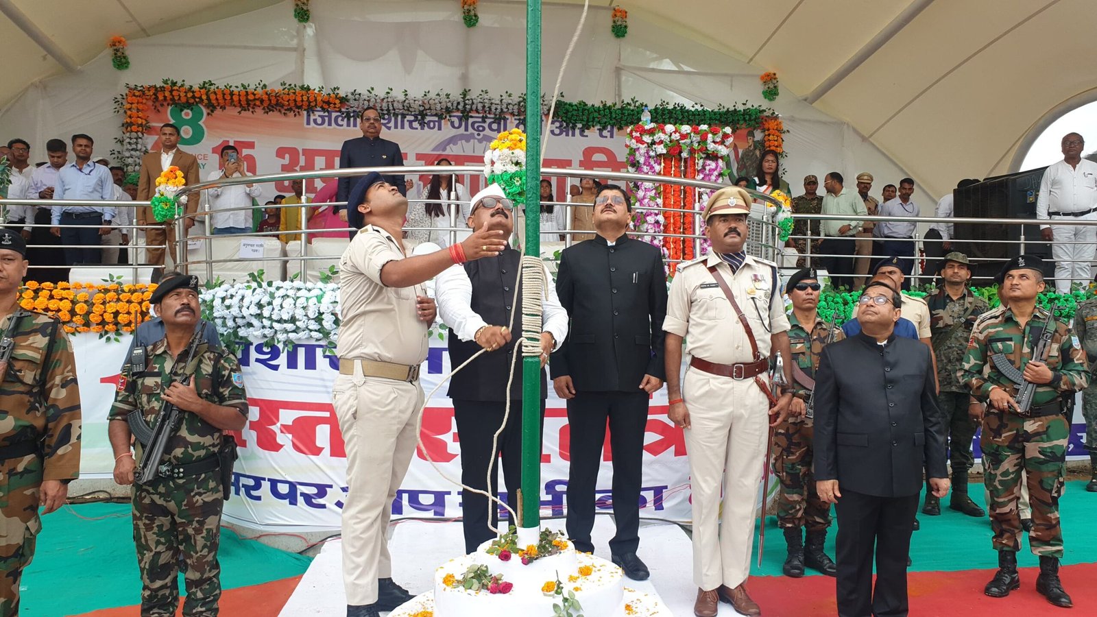 78 वें स्वतंत्रता दिवस के अवसर पर 15 अगस्त 2024 को उपायुक्त सह जिला दंडाधिकारी श्री शेखर जमुआर ने समाहरणालय परिसर में ध्वजारोहण किया। समाहरणालय परिसर में ध्वजारोहण कार्यक्रम के मौके पर उपायुक्त- सह-जिला दंडाधिकारी श्री शेखर जमुआर के अलावे पुलिस अधीक्षक श्री दीपक कुमार पाण्डेय, सीआरपीएफ कमांडेंट,उप विकास आयुक्त श्री पशुपति नाथ मिश्रा, अनुमण्डल पदाधिकारी, गढ़वा सहित समाहरणालय के सभी पदाधिकारी एवं कर्मी मौजूद थे।