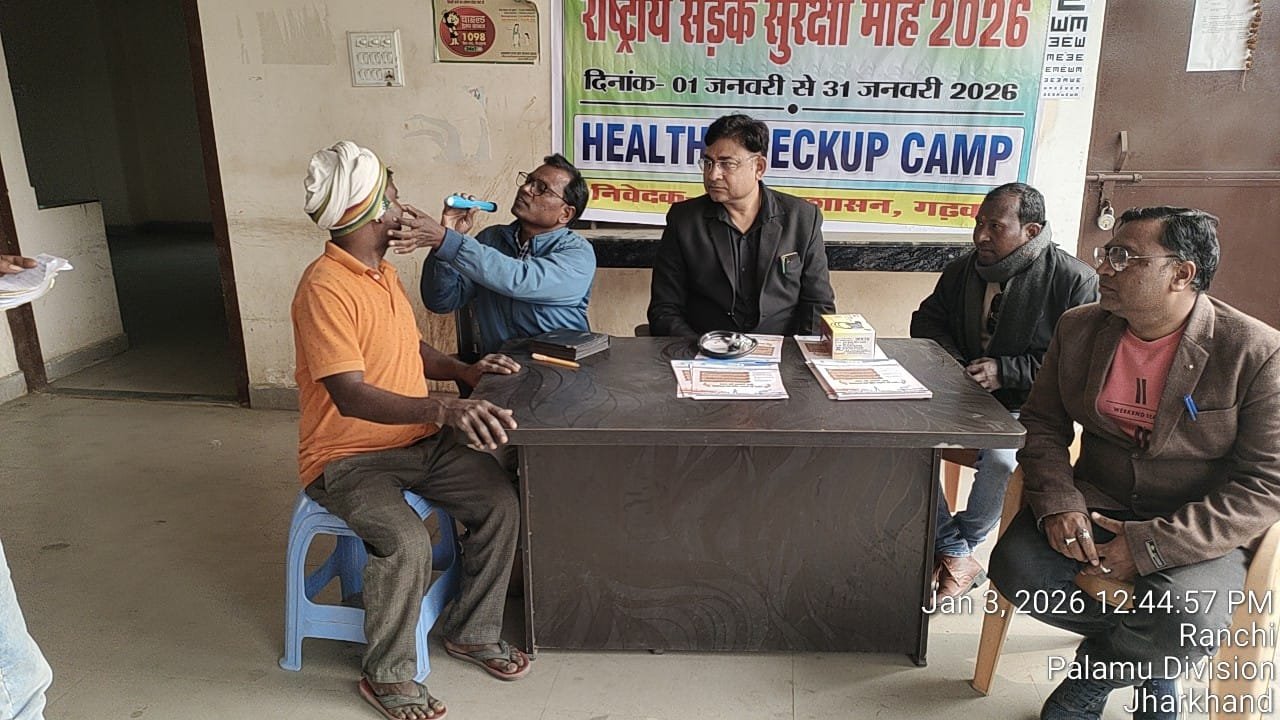 राष्ट्रीय सड़क सुरक्षा माह 2026 के अंतर्गत शनिवार को एक विशेष स्वास्थ्य शिविर का आयोजन किया गया। *सीख से सुरक्षा और तकनीक से परिवर्तन* अभियान के क्रम में गढ़वा बस स्टैंड में वाहन चालकों के लिए *नि:शुल्क नेत्र एवं व्यापक स्वास्थ्य जाँच शिविर* लगाया गया। इस कार्यक्रम का मुख्य उद्देश्य यह सुनिश्चित करना था कि सड़कों पर दौड़ने वाले वाहनों का नियंत्रण न केवल अनुभवी हाथों में हो बल्कि शारीरिक रूप से स्वस्थ और सही दृष्टि वाले चालकों के पास हो।
