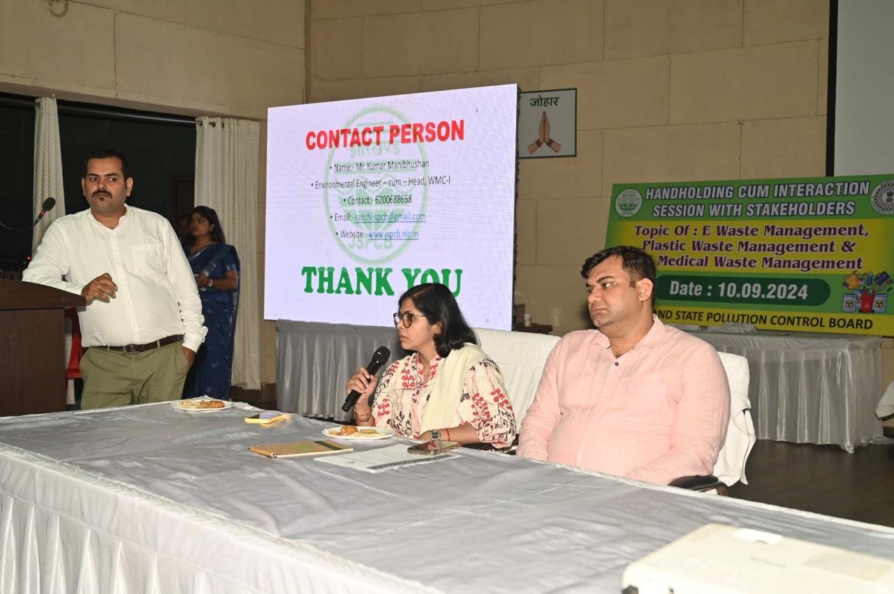 इस कार्यक्रम में तीन अपशिष्ट के विषय,पहला-ई-वेस्ट मैनेजमेंट, दूसरा, प्लास्टिक वेस्ट मैनेजमेंट और तीसरा, बायो मेडिकल वेस्ट मैनेजमेंट के संबंध में विस्तृत जानकारी पर्षद के श्री कुमार मणिभूषण , पर्यावरण अभियन्ता, श्री कुमार गौरव जैन, पर्यावरण अभियन्ता, श्रीमती प्रतिभा प्रिया, वैज्ञानिक एवं श्री नवनीत कुमार, कनीय शोध फेलो जेआरएफ के द्वारा दी गई।