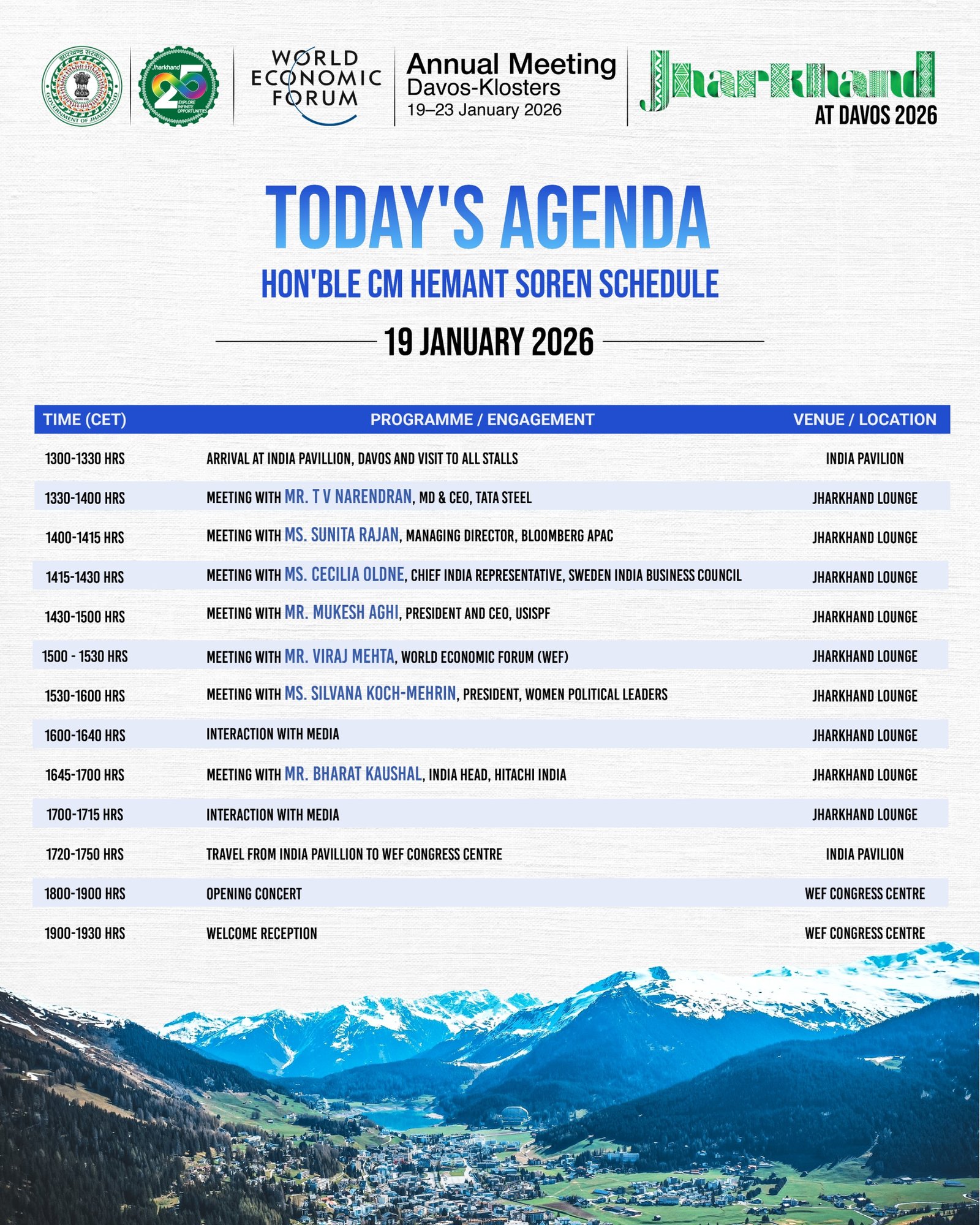 रांची /दावोस: युवा झारखण्ड दावोस में आयोजित विश्व आर्थिक मंच की वार्षिक बैठक 2026 के उद्घाटन समारोह के उपरांत उच्च स्तरीय बैठक में मुख्यमंत्री हेमन्त सोरेन के नेतृत्व में ग्लोबल इकोनॉमिक और नीतिगत चर्चाओं में मजबूती से अपनी स्थिति से दुनिया को अवगत कराएगा। प्रतिनिधिमंडल दीर्घकालिक अंतरराष्ट्रीय साझेदारी और निवेश के अवसरों को मजबूत करने के उद्देश्य से आयोजित सुनियोजित वार्ताओं के साथ अपनी भागीदारी का शुभारंभ कर रहा है।