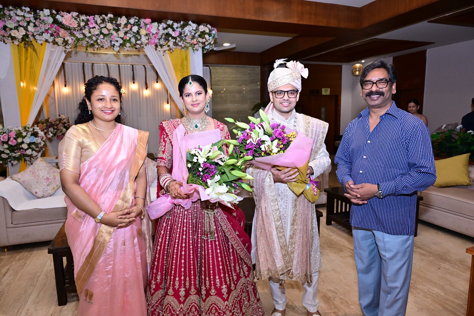 मुख्यमंत्री श्री हेमन्त सोरेन अपनी धर्मपत्नी विधायक श्रीमती कल्पना सोरेन के साथ आज दीनदयाल नगर, बूटी रोड, रांची स्थित आईएएस क्लब पहुंचे। मुख्यमंत्री वहां उपायुक्त (DC), पूर्वी सिंहभूम, जमशेदपुर, श्री राजीव रंजन की सुपुत्री ऋचा के वैवाहिक समारोह में सम्मिलित हुए। इस अवसर पर मुख्यमंत्री ने नवदंपति वर-वधू को आशीर्वाद एवं सुखद दाम्पत्य जीवन की शुभकामनाएं दी। मौके पर मुख्यमंत्री श्री हेमन्त सोरेन एवं विधायक श्रीमती कल्पना सोरेन ने उपायुक्त श्री राजीव रंजन एवं उनके सगे-संबंधियों से मुलाकात कर उन्हें हार्दिक बधाई दी तथा हर्ष व्यक्त किया।