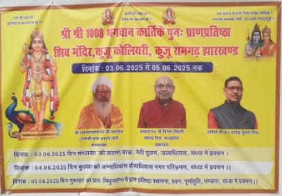 रामगढ़, झारखंड: कुजू कोलियरी शिव मंदिर में आगामी 3 जून से तीन दिवसीय श्री श्री 1008 भगवान कार्तिकेय पुनः प्राण प्रतिष्ठा महायज्ञ का आयोजन होने जा रहा है। इस धार्मिक आयोजन की तैयारियां जोरों पर हैं। महायज्ञ समिति के अध्यक्ष चितरंजन सिंह उर्फ पप्पू, सचिव आदित्य शंकर सिंह, और कोषाध्यक्ष सरोजा नंद झा ने संयुक्त रूप से बताया कि 3 जून को भव्य कलश यात्रा के साथ महायज्ञ का शुभारंभ होगा। इस उत्सव में क्षेत्र के धर्मप्रेमी भक्तों की भागीदारी से मंदिर परिसर आध्यात्मिक ऊर्जा से सराबोर होगा। आयोजन समिति ने सभी से तन, मन, और धन से सहयोग करने की अपील की है।