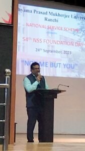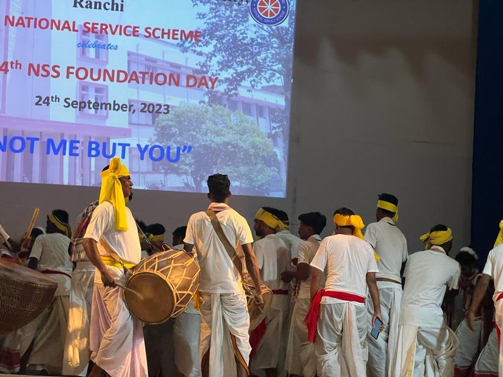 आज दिनांक 24 सितंबर को dr श्यामा प्रसाद मुखर्जी विश्वविद्यालय, रांची के एनएसएस विंग के द्वारा एनएसएस के 54वें स्थापना दिवस के मौके पर कई सांस्कृतिक कार्यक्रमों का आयोजन किया गया। मौके पर जनजातीय सामूहिक नृत्य, एकल गीत, कथक नृत्य और सामूहिक नृत्य और एनएसएस वोलेंटियर के द्वारा एनएसएस से सबंधित नाट्य प्रस्तुति दी गई। इसके पूर्व द्वीप प्रज्वलित कर कार्यक्रमों की शुरुआत की गई। स्वागत भाषण और विषय प्रवेश एनएसएस के कार्यक्रम अधिकारी डॉ अभय कृष्ण सिंह ने किया। मुख्य अतिथि और अध्यक्षता करते हुए विश्वविद्यालय के कुलपति डॉ तपन कुमार शांडिल्य ने कहा कि एनएसएस युवाओं को सामुदायिक सेवा के लिए उन्मुख करता है उन्होंने आगे कहा कि प्रारंभ में 37 विश्वविद्यालयों और40, 000 स्वयंसेवियों के साथ शुरू हुआ यह अभियान आज दिन प्रतिदिन प्रगति की ओर अग्रसर है।