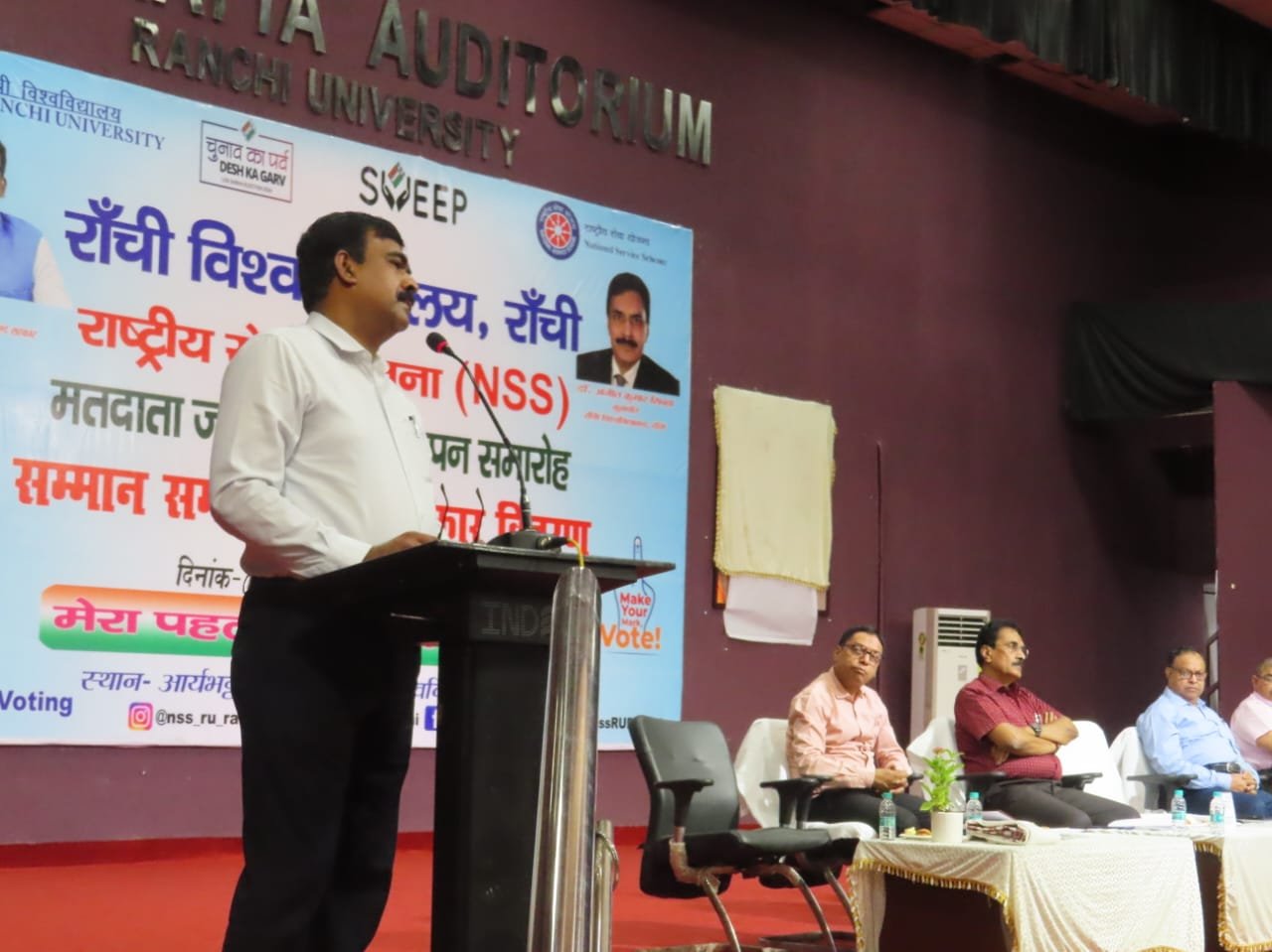 रांची विश्वविद्यालय रांची के कुलपति डॉ. अजीत कुमार सिन्हा ने कहा कि मतदान करना अधिकार के साथ हमारा कर्तव्य है। उन्होंने एनएसएस के वालेंटियर्स में उत्साह भरते हुए कहा कि आपकी मेहनत का फल मतदान के दिन दिखेगा। उन्होंने इसका उदाहरण एडमिट कार्ड वितरण एवं परीक्षा से देते हुए कहा कि मतदान के दिन मतदाताओं को सहयोग कर अधिक-से अधिक मतदान करवाना बेहतर अंक प्राप्त करने जैसा है। उन्होंने कहा कि आप सभी फ्यूचर ऑफ नेशन हैं। अपने कर्तव्यों को समझें और उसका निर्वहन करते हुए मतदाताओं को मतदान के लिए प्रेरित करें।