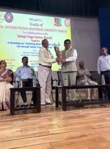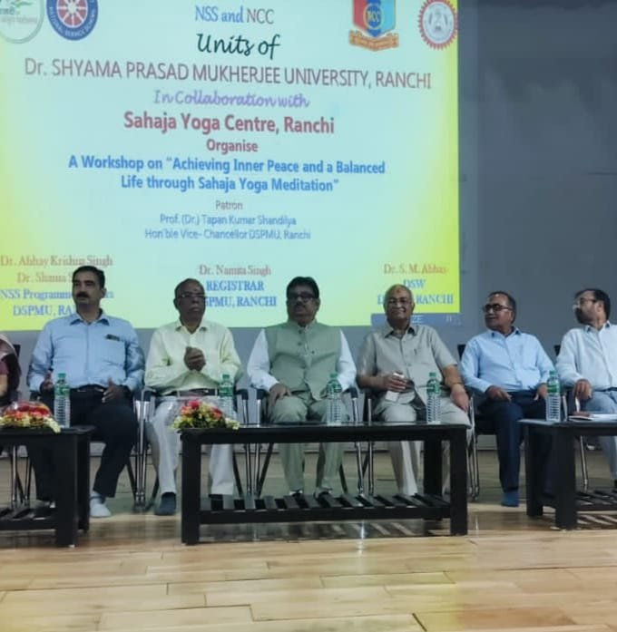 आज दिनांक 20 मई को अपराह्न 11 बजे dr श्यामा प्रसाद मुखर्जी विश्वविद्यालय, रांची के सभागार में विश्वविद्यालय के एनएसएस, एनसीसी इकाई और सहज योग ट्रस्ट, रांची केंद्र के संयुक्त तत्वावधान में एक कार्यशाला का आयोजन किया गया । विषय था , सहज योग ध्यान के माध्यम से आंतरिक शांति और संतुलित जीवन प्राप्त करना। कार्यक्रम की अध्यक्षता करते हुए विश्वविद्यालय के कुलपति dr तपन कुमार शांडिल्य ने कहा कि सहज योग ध्यान एक सरल, समय सम्मानित तकनीक है। यह हमारे दैनिक जीवन में तनाव को कम करने और स्वास्थ्य के दृष्टिकोण से एक बेहतर क्रिया है।